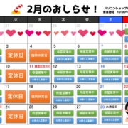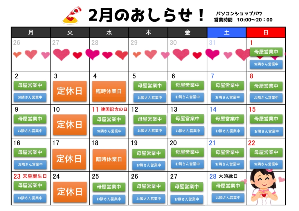 大須パソコンショップ パウ 2月の営業カレンダー毎度ありがとうございます~ 2月の営業カレンダーです 「購入品」、「レシート」を撮影して 『#パウもりあげ隊』とフォロー&ポストで店頭粗品進呈中です! →リポスト気まぐれなのでご容赦です~